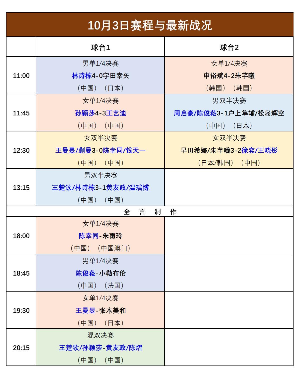 当日晚间将进行2场女单1/4决赛、1场男单1/4决赛及混双决赛,期待国乒选手延续强势表现。