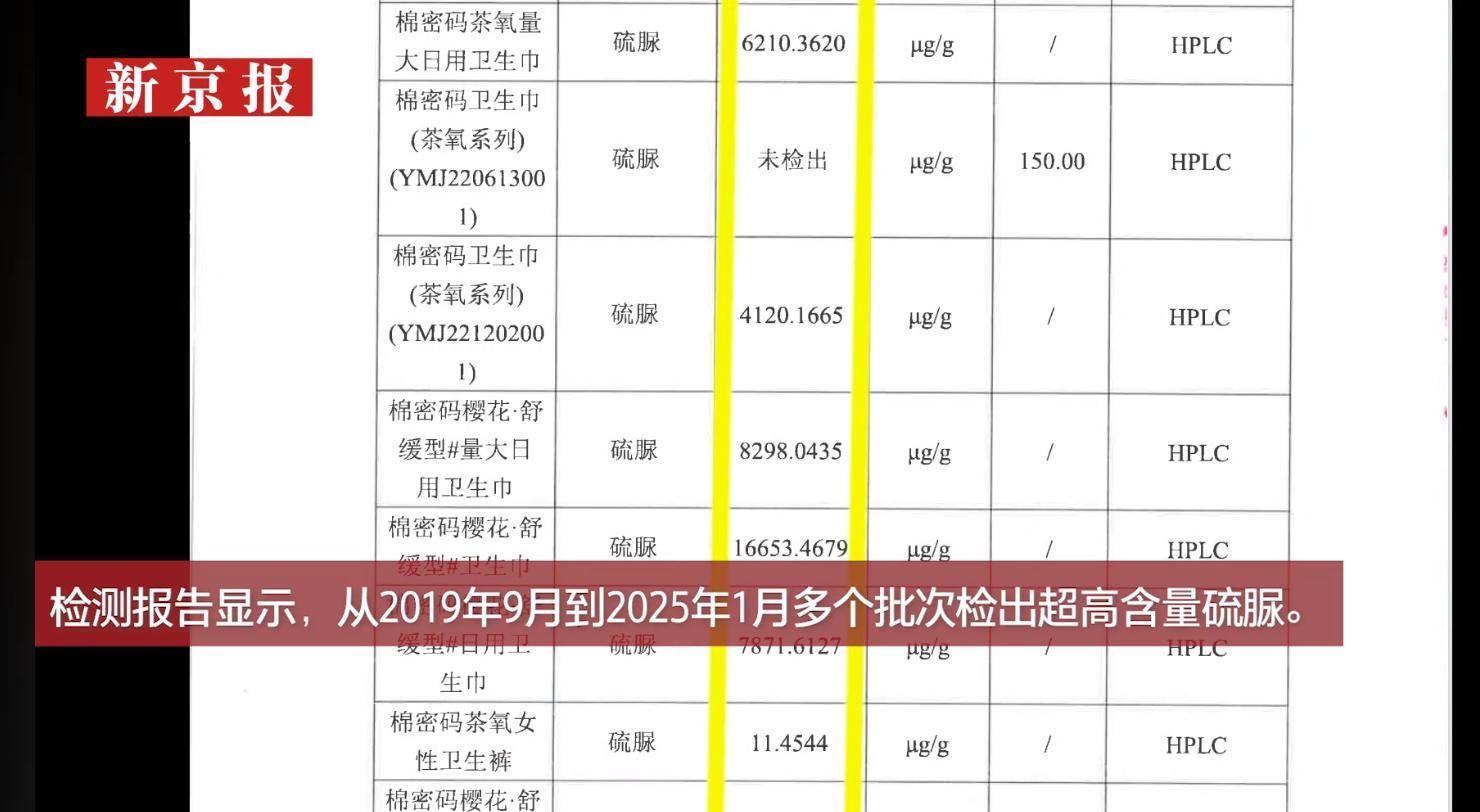 受害者们联合将产品送检,结果显示卫生巾中含有致癌物“硫脲”,最高含量竟达16653μg/g!