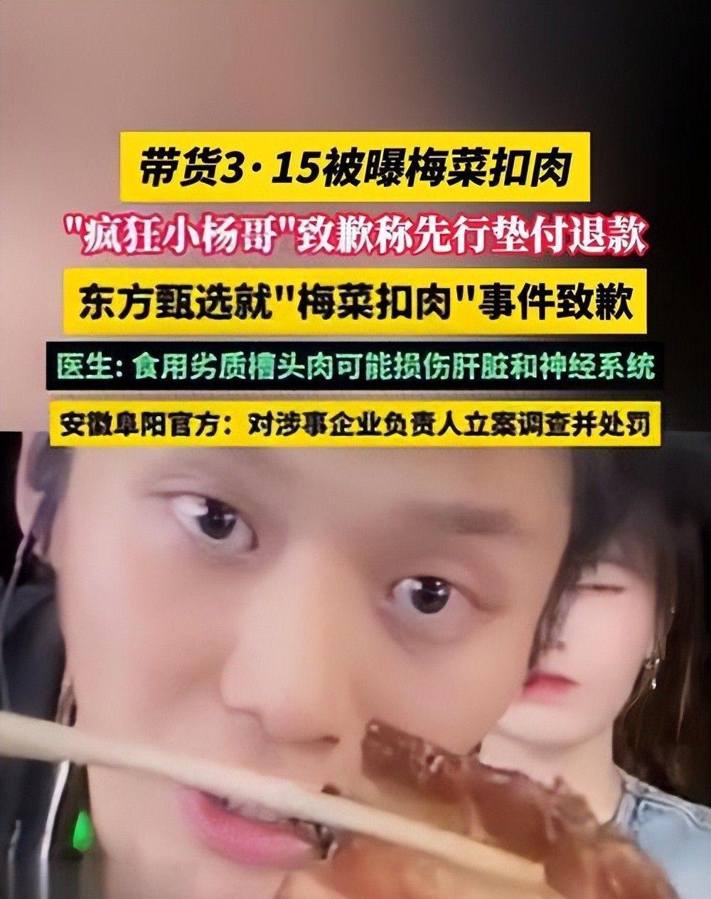 2024年3月,他主推的“梅菜扣肉”使用的是国家明令禁止的淋巴肉(槽头肉),被央视315晚会曝光。
