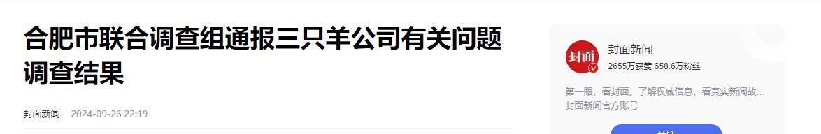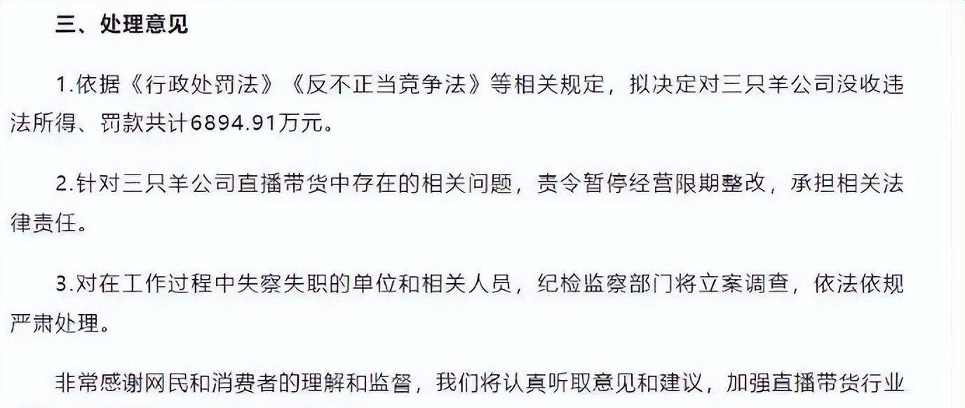 2024年9月26日,合肥市市场监督管理局发布公告:三只羊公司因“多次虚假宣传、销售不合格食品”,被罚款6894.91万元,并被责令暂停经营3个月进行整改。