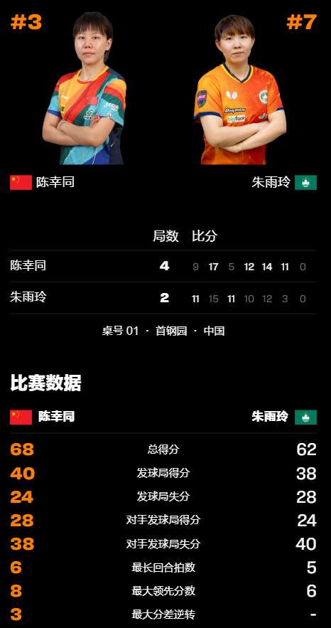 第二局:朱雨玲再取3-0开局,陈幸同通过接发球劈长策略追至7-8。暂停后,陈幸同以17-15扳平比分。