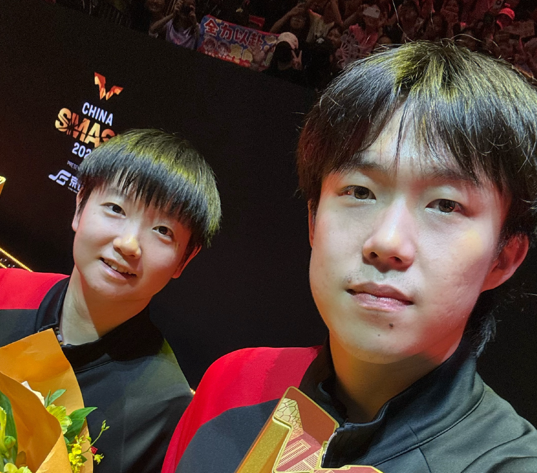 孙颖莎则对成绩表示满意:“八年的配合让我们很有默契,虽然近期混双训练时间不多,但大头同时参加三项比赛,我们还是通过比赛找到了最佳状态。肖指导告诉我们目标是年底总决赛,这次比赛表现不错。”她特别提到王楚钦的三线作战:“大头一个人打三个项目,体能消耗非常大。之前他就说过体能快到极限了,今天还好只有两场比赛,不然真的会接近绝望。”