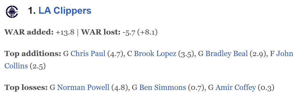 尽管小卡深陷“阴阳合同”传闻,但快船队在休赛期的阵容操作依然可圈可点。他们不仅高位套现送走了季后赛表现不佳的鲍威尔,还针对性补强了首发4号位科林斯,减轻了小卡在防守端的压力。更令人瞩目的是,快船队一口气低价抄底了保罗、比尔与大洛三名昔日全明星球员。高阶数据WAR显示,快船队引进的4名新援WAR均超过2.5,其中保罗更是高达4.7,而离队球员中仅鲍威尔的WAR超过1。