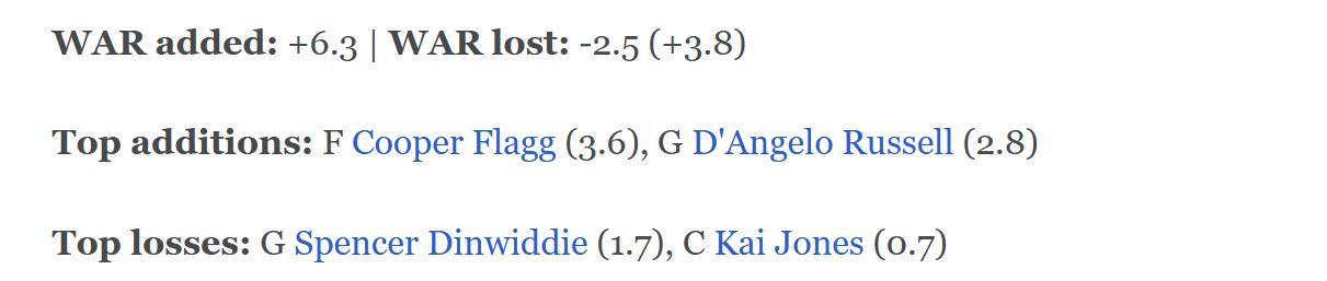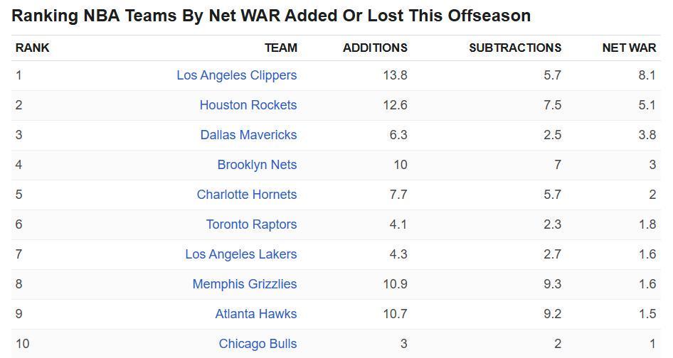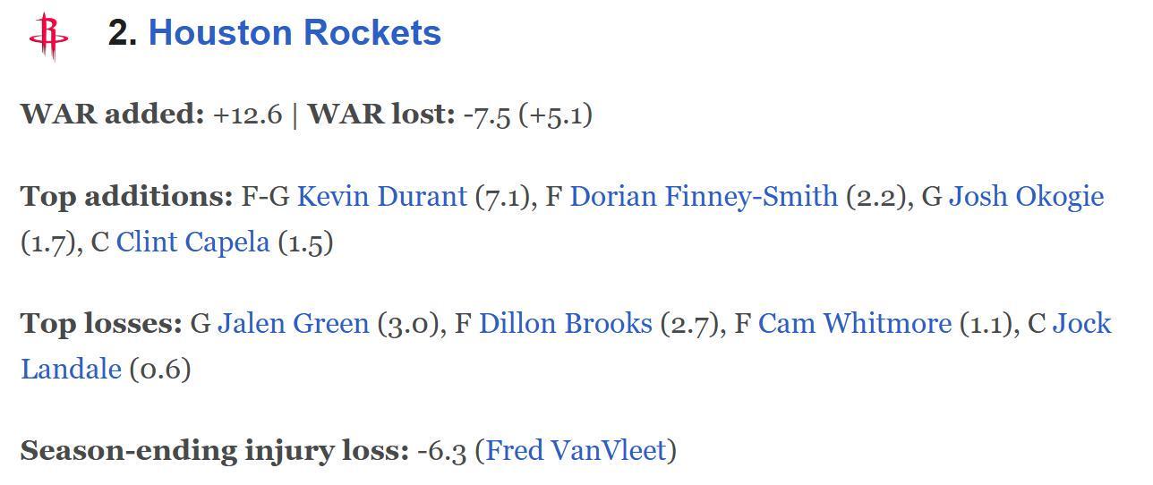 火箭队原本是休赛期的最大赢家之一。他们通过一笔低廉的8换1交易拿下了杜兰特,完成了对关键球与得分强解能力的针对性补强。接着,火箭队又利用中产特例先后签下了芬尼史密斯与“饼皇”卡佩拉,实现了对狄龙与兰代尔离队后相应位置的填补与升级。此外,他们还用一份底薪签下了奥科吉,取代了白魔,提升了球队的稳定性与侧翼深度。整个引援过程仅花费了一枚首轮签和5枚次轮签,火箭队一度成为争冠大热门。然而,高阶WAR数据显示,由于范乔丹在训练营开启前重伤,且其WAR值高达6.3,导致火箭队遗憾无缘榜首。