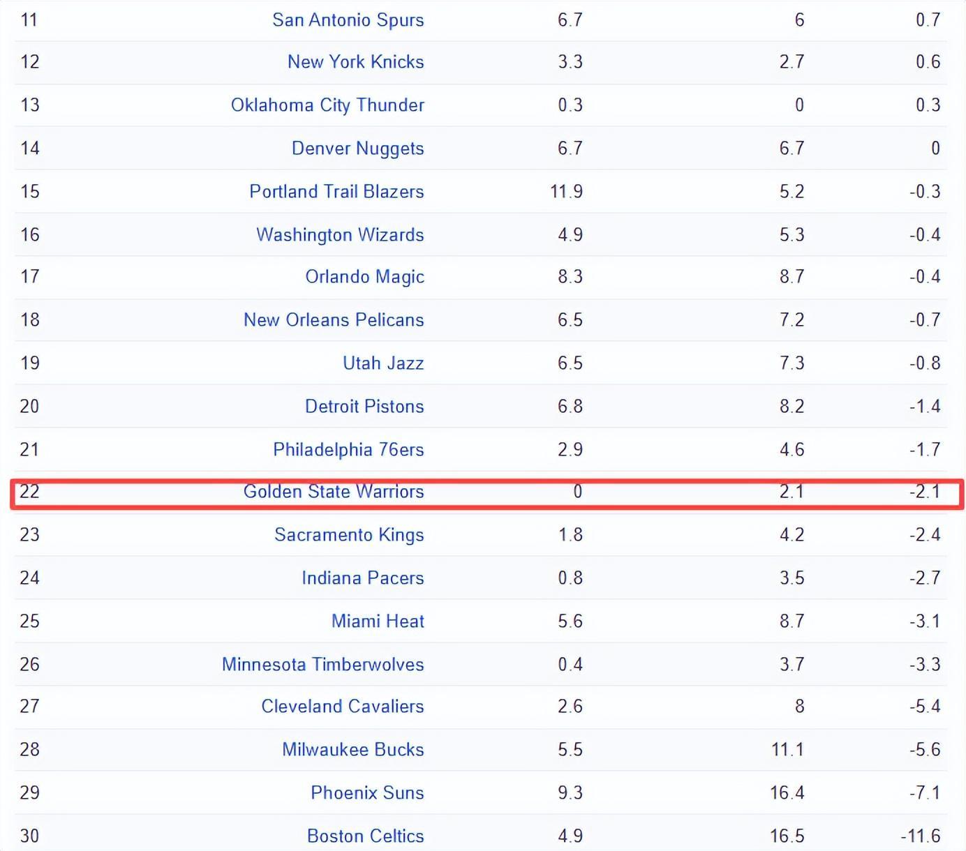 21-30名:76人、勇士、国王、步行者、热火、森林狼、骑士、雄鹿、太阳、凯尔特人。