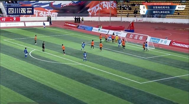 下午3时许,随着裁判一声哨响,比赛正式拉开帷幕。上半场第25分钟,绵阳九洲长虹队球员肖俊抓住机会,打入一球,帮助球队以1:0领先。下半场,绵阳队继续保持攻势,第73分钟时再下一城,将比分扩大至2:0。尽管甘孜队在主场球迷的助威声中奋力反击,但始终未能攻破绵阳队的球门,最终以0:2遗憾落败。