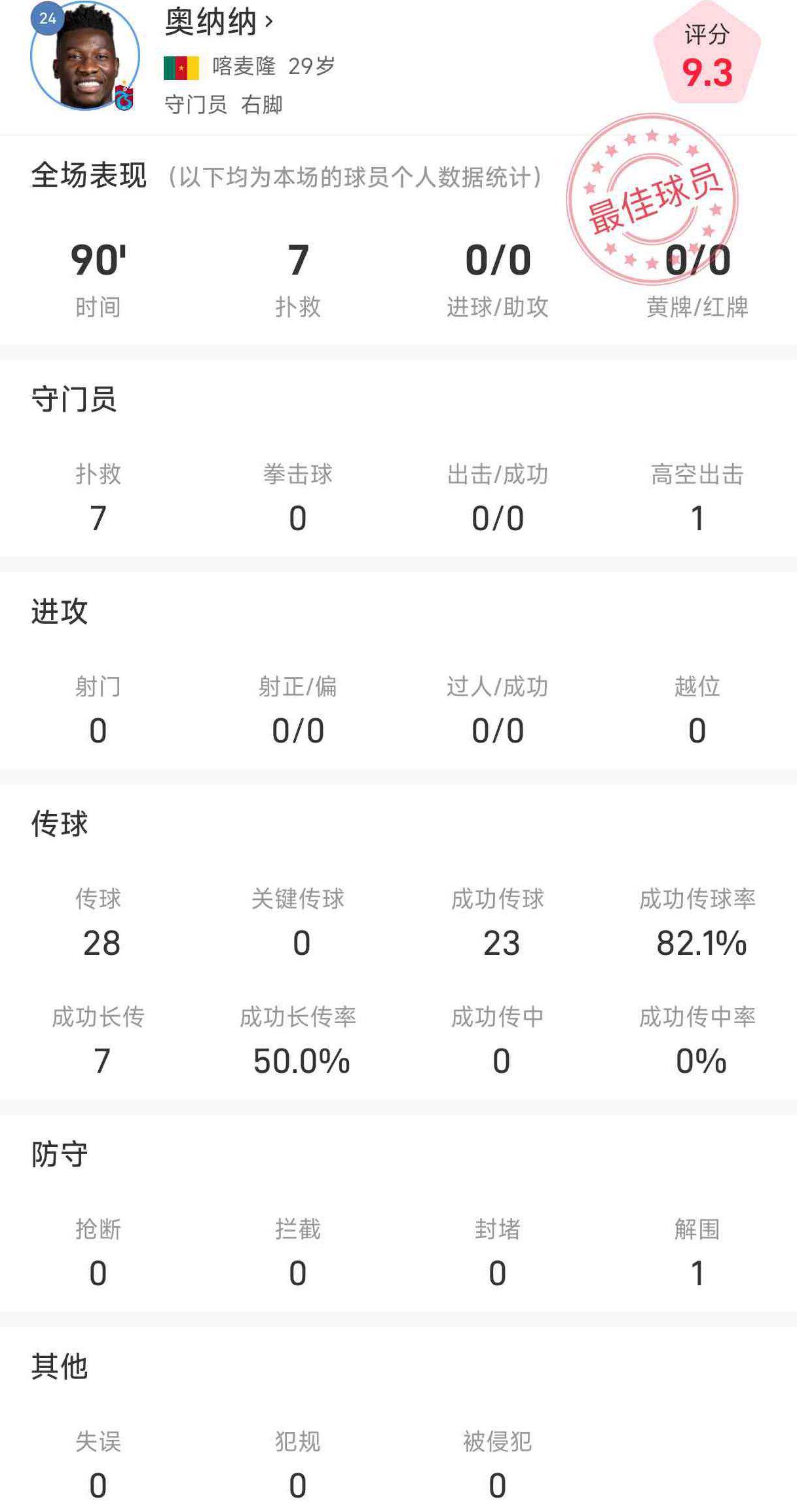 奥纳纳赛后获得了数据网站9.3分的高分,并毫无悬念地被评为本场最佳球员。这一评分不仅体现了他在比赛中的出色表现,也反映了他在球队中的重要地位。