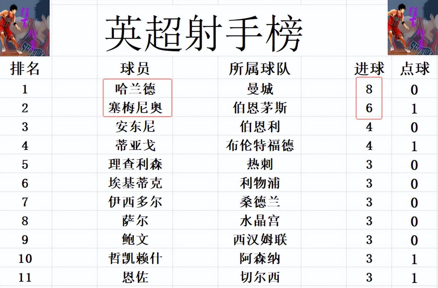 射手榜争夺白热化,哈兰德以8球领跑,塞梅尼奥凭借本场2射1传将进球数提升至6球紧随其后,安东尼、蒂亚戈同以4球并列第三,萨尔、鲍文等5人3球入围前十。