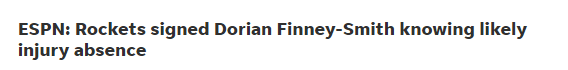 ESPN名记蒂姆-麦克马洪近日在参加节目时表示,火箭对于芬尼-史密斯目前的情况并没有感到意外。原来,火箭在签约芬尼-史密斯前就已经知道他的身体状况,并做好了他无法参加训练营的准备。芬尼-史密斯上赛季一直在带伤作战,六月份ESPN就爆料他接受了手术来解决左脚踝的问题。