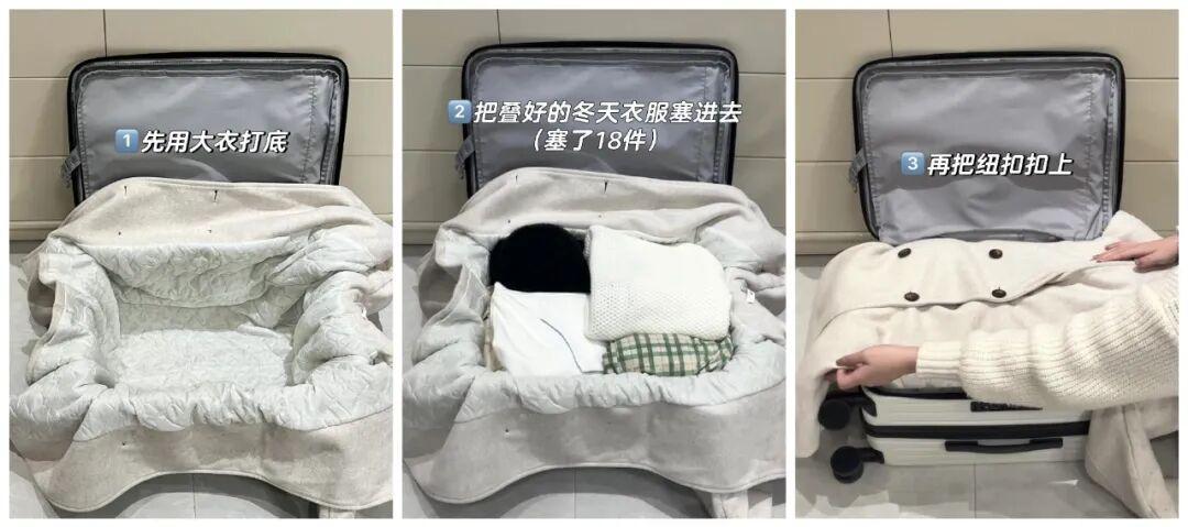 冬季出行必备的大衣总占行李箱大半空间?试试这个方法:将大衣平铺打底,把其他衣物塞进衣袖和衣身,最后折叠系扣。这个方法能瞬间释放50%的行李空间,实测可多装3件毛衣。