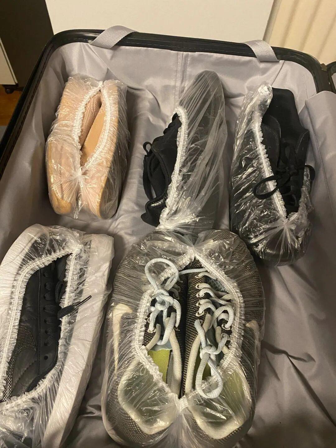 用浴帽包裹鞋子再放入行李箱,既能防止鞋底弄脏衣物,又能保持鞋型。实测比专用鞋袋更轻便,特别适合运动鞋收纳。