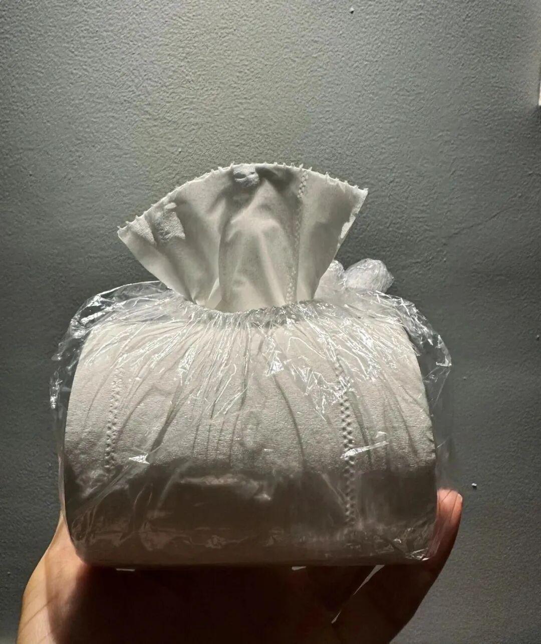 将整卷卫生纸装入浴帽,抽取口朝上放置。这个方法能保持卷纸干燥卫生,特别适合南方潮湿地区出行。