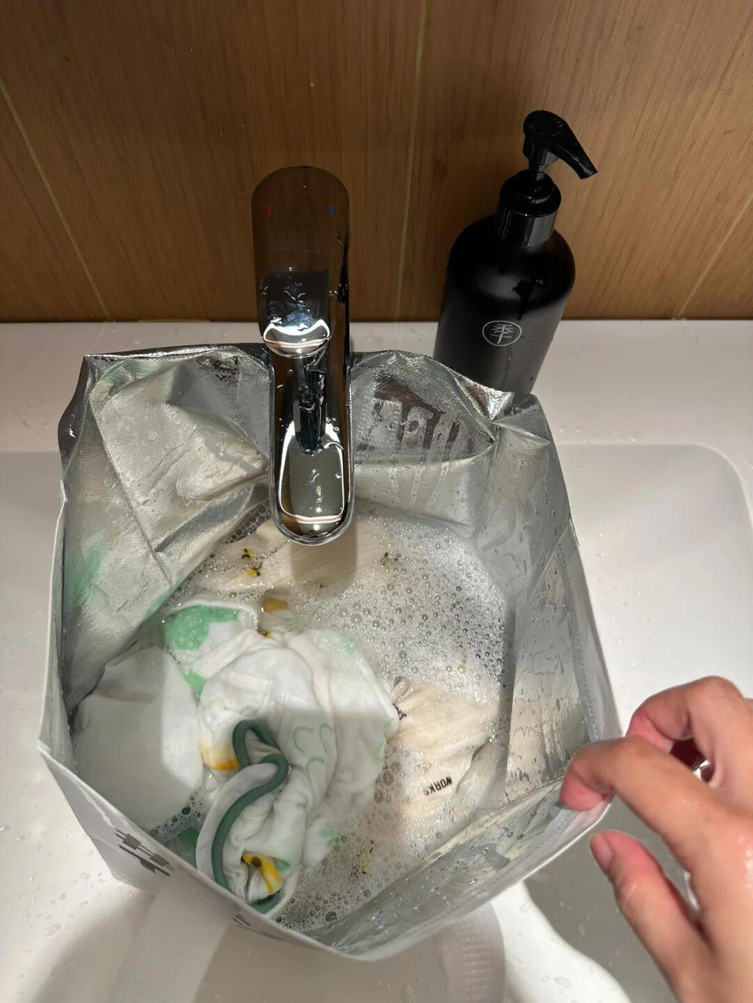 带保温层的奶茶袋装水不漏,实测可容纳5升水,足够手洗两件T恤。比酒店脸盆更卫生。