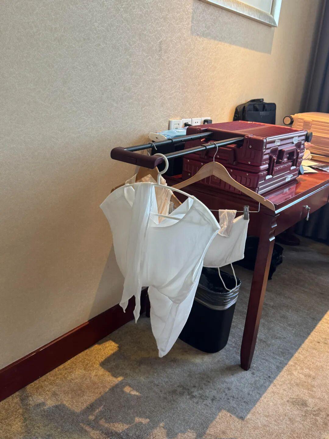将行李箱拉杆完全拉出,把洗好的衣物搭在拉杆上。实测可同时晾晒5件T恤,且不会留下折痕。