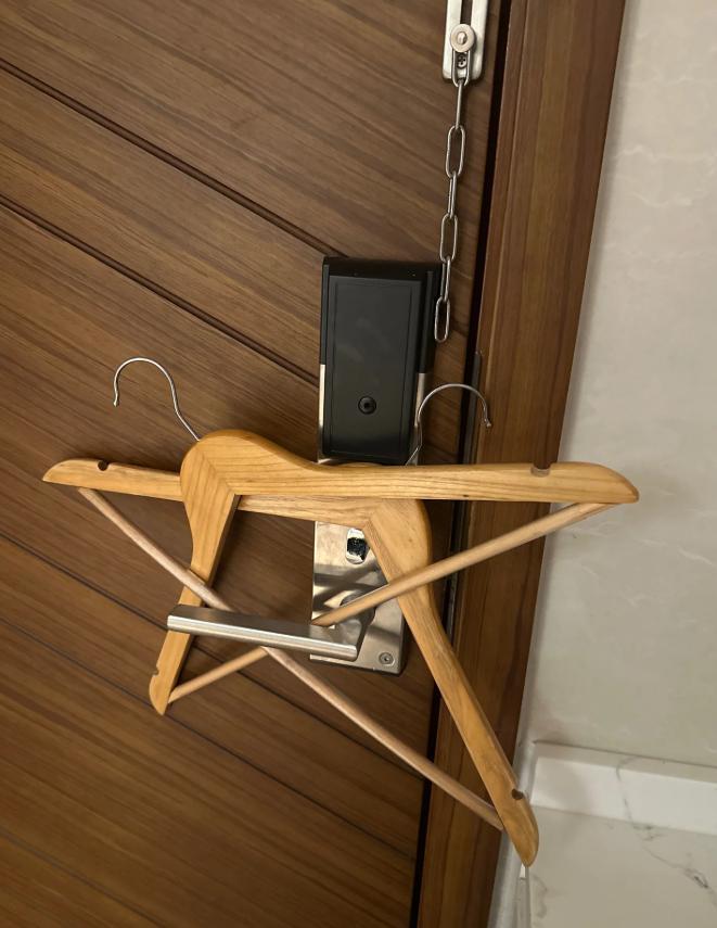 用两个带夹角的衣架交叉固定在门把手上,实测能承受50kg的推力,有效防止深夜闯入。