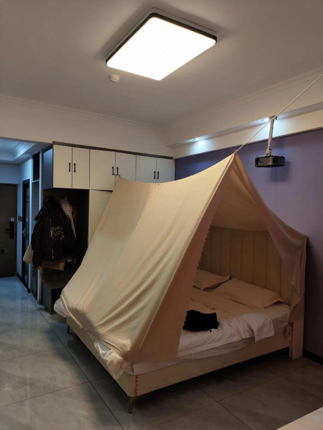 用绳子+床单在床四周搭建简易床帐。实测能遮挡95%的视线角度,特别适合年轻女性独居。