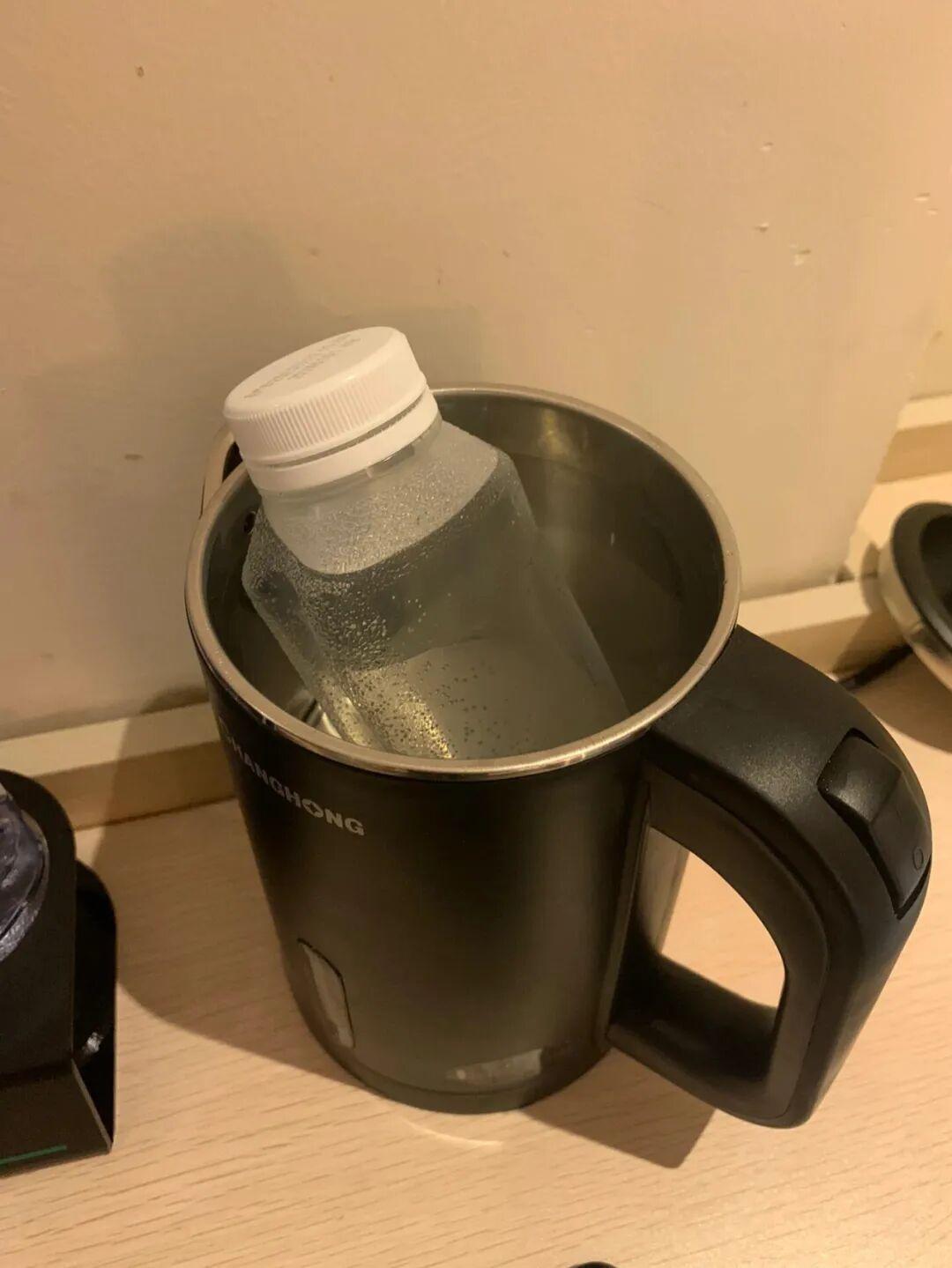将矿泉水倒入空味全瓶,用热水壶间接加热。实测3分钟可使水温达到50℃,既安全又卫生。