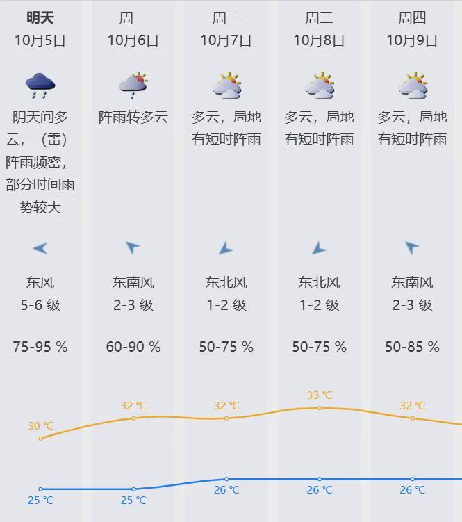 10月4日夜间至5日受台风环流影响,间歇性阵雨频密,部分时间雨势较大,有局地暴雨风险。据“深圳天气”最新预报: