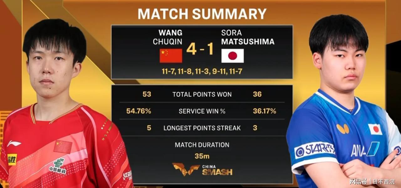 首局王楚钦通过提升前三板质量,在4-5落后时连得6分,11-7先下一城;次局松岛辉空5-2开局后,王楚钦追至8-8并连得3分,11-8再胜;第三局王楚钦4-1开局后扩大优势,11-3轻松拿下。第四局松岛辉空9-9追平后,以11-9扳回一城;决胜局王楚钦4-1打停对手后,最终11-7锁定胜局。