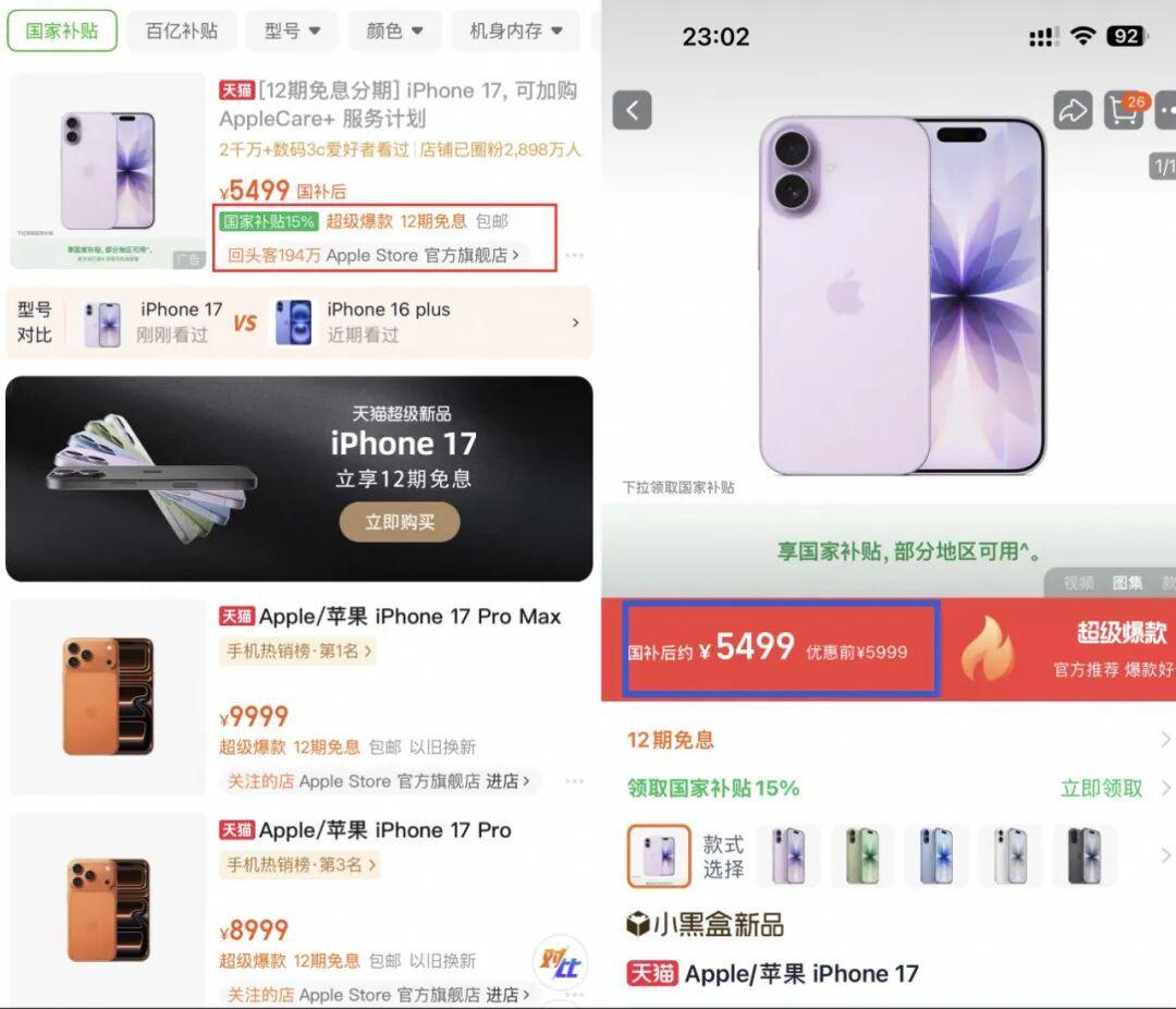 例如,某猫Apple Store官方旗舰店作为苹果官方认证的平台,128GB版iPhone17同样支持国补直减500元,且受众地区更广。此外,某东苹果自营店销售的iPhone17也支持国补,但需注意,这并非苹果官方渠道,而是某东自营的苹果产品平台。