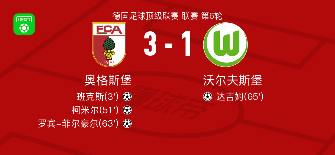 北京时间10月4日晚,德国足球顶级联赛(德甲)第6轮展开一场焦点对决,奥格斯堡坐镇主场迎战沃尔夫斯堡。最终,奥格斯堡凭借班克斯、柯米尔和罗宾-菲尔豪尔的进球,以3-1的比分战胜对手,全取三分。