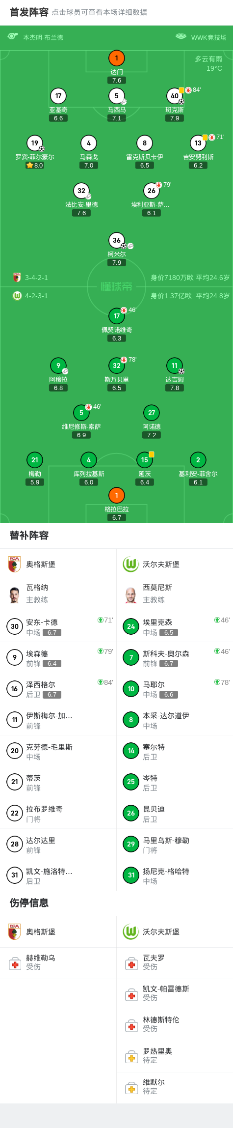 比赛进程:奥格斯堡多点开花,沃尔夫斯堡末段破门