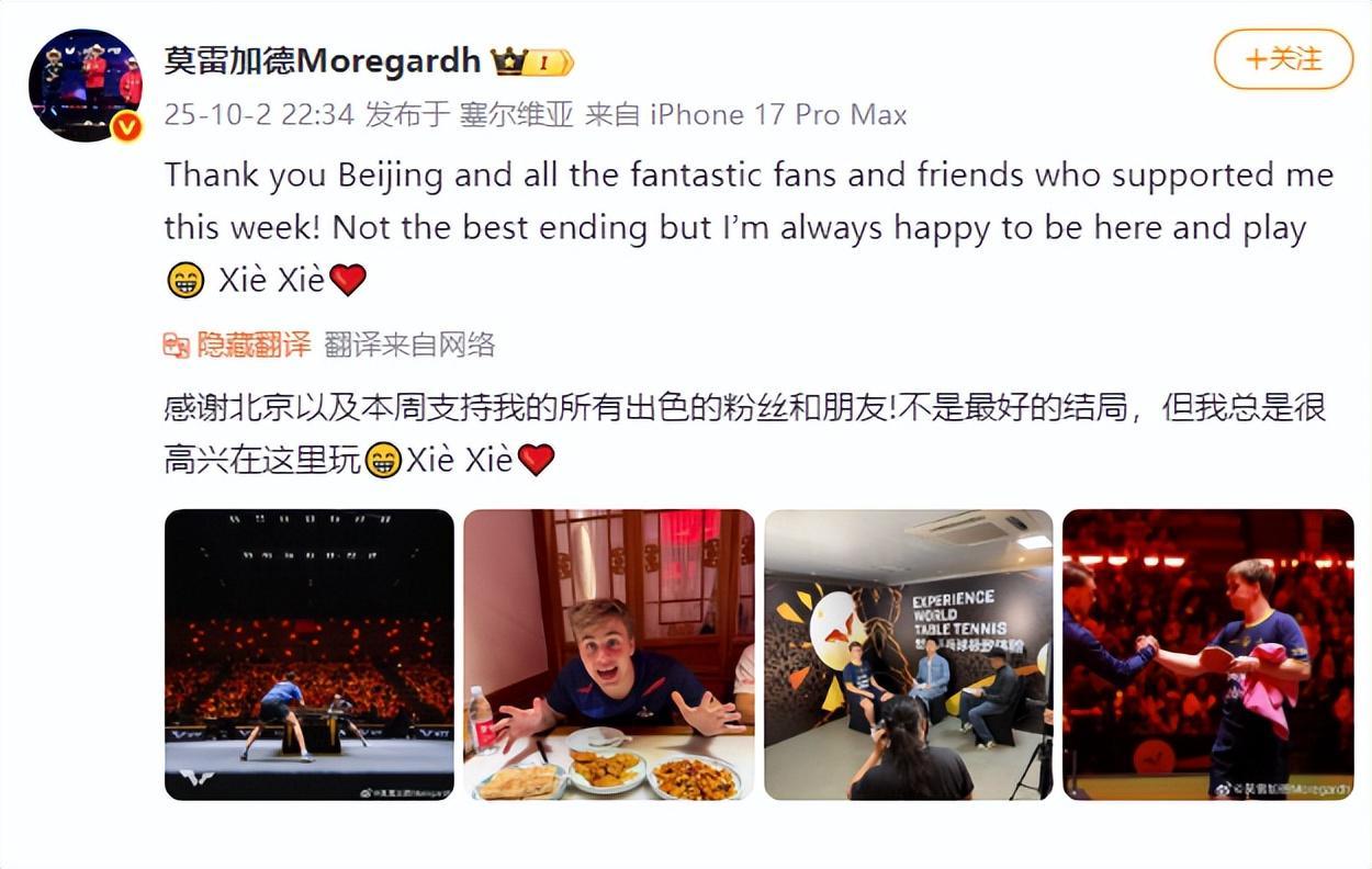 在众多参赛球员中,输球后能专门发文致谢主办城市的并不多见,而莫雷加德却做到了。从这些细节中不难看出,他确实对中国和北京充满了喜爱。在这里,他结识了许多朋友,也留下了许多美好的回忆与体验。