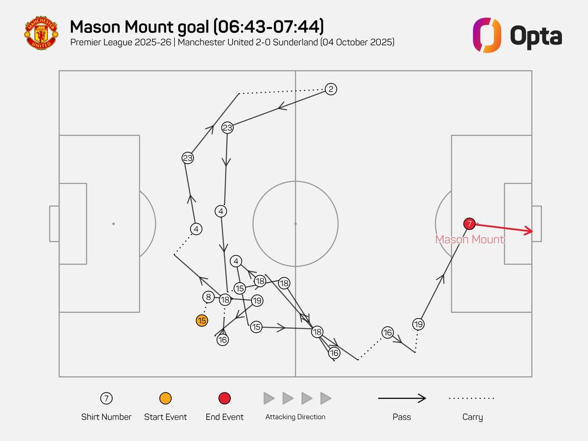 英超第7轮赛事中,曼联坐镇主场迎战桑德兰,比赛上半场,芒特凭借一记精彩进球为曼联首开记录。值得一提的是,这粒进球经历了连续18次传球,创下了曼联近两年来英超进球前的最长传球记录。