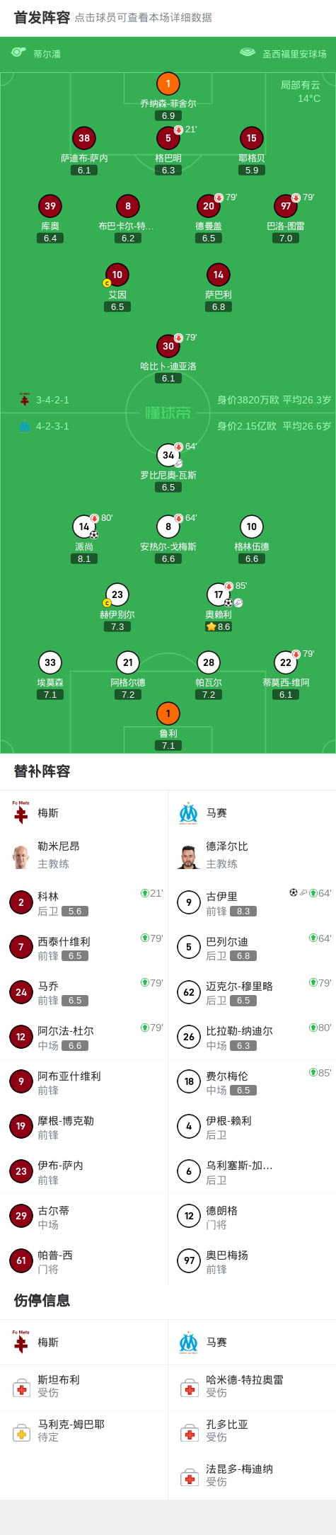 此役过后,马赛以4胜2平1负积14分暂列第三,下轮将迎战强敌里尔。梅斯则遭遇两连败,保级形势愈发严峻。