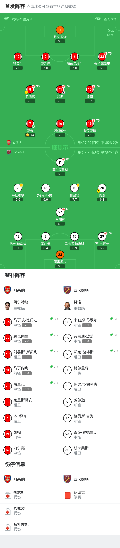 阿尔特塔延续4-3-3体系,拉亚把守球门,萨利巴与加布里埃尔组成中卫搭档。赖斯与厄德高(21分钟伤退)掌控中场,萨卡、马丁内利、哈弗茨构成进攻三叉戟。西汉姆联排出4-2-3-1阵型,安东尼奥突前,帕奎塔坐镇中场。