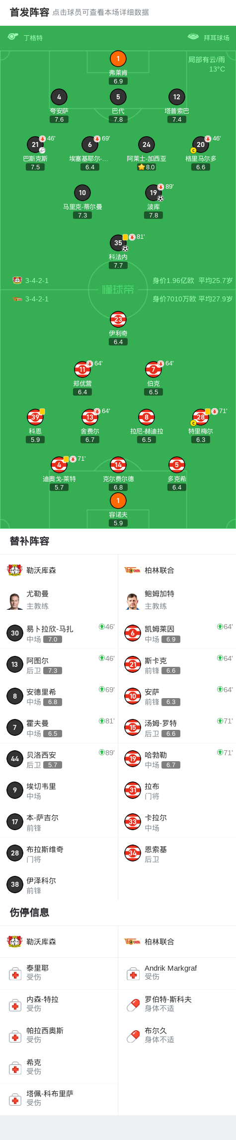第53分钟,勒沃库森再次获得破门良机,可惜因越位在先被判无效,球员们显得十分懊恼。