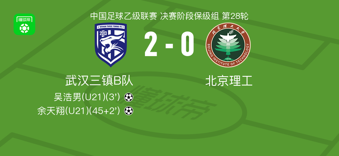 北京时间10月4日,2025赛季中国足球乙级联赛决赛阶段保级组第28轮迎来关键对决,武汉三镇B队坐镇主场迎战北京理工。经过90分钟激烈角逐,武汉三镇B队凭借吴浩男和余天翔的进球,以2-0的比分完胜对手,成功拿下保级路上的重要三分。