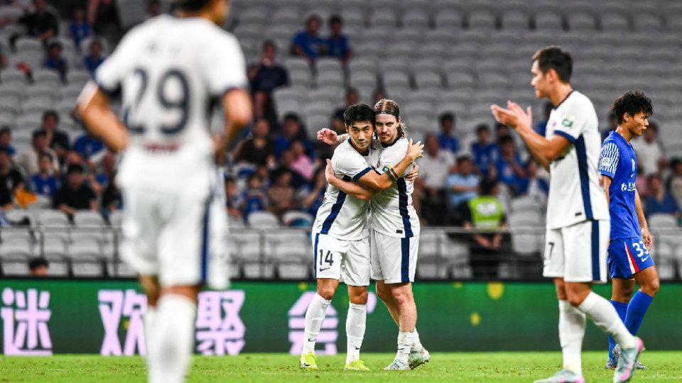 第43分钟,茹子楠左路内切之后右脚劲射,皮球如出膛炮弹般直入死角,韩镕泽扑救不及,梅州客家取得领先。这粒进球不仅点燃了全场球迷的热情,也为梅州客家奠定了胜局。