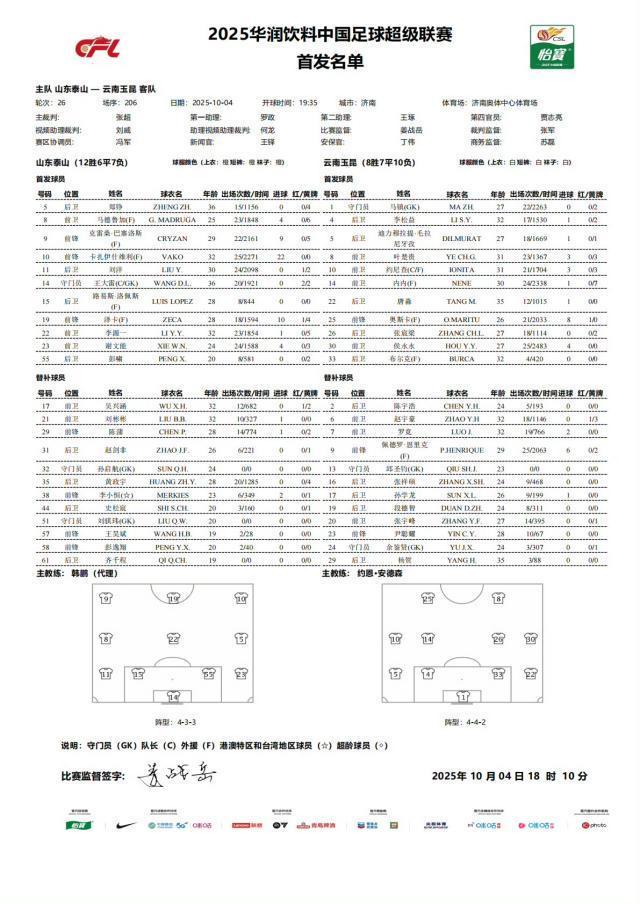 北京时间10月4日19:35,中超联赛第26轮迎来一场焦点补赛,山东泰山坐镇主场迎战云南玉昆。这场比赛不仅关乎两队的积分排名,更因双方外援的配置而备受关注。