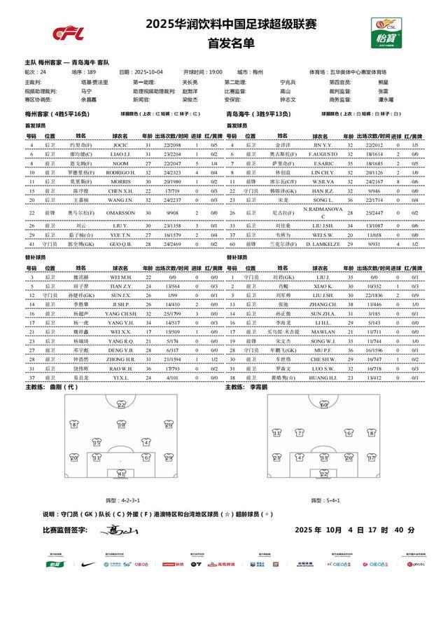 北京时间10月4日19:00,中超联赛第24轮将迎来一场焦点对决——梅州客家坐镇主场迎战青岛海牛。这场比赛不仅关乎两队排名,更因双方均派出五名外援出战而备受关注,其中刘云、林创益等球员的登场也成为赛前热议话题。