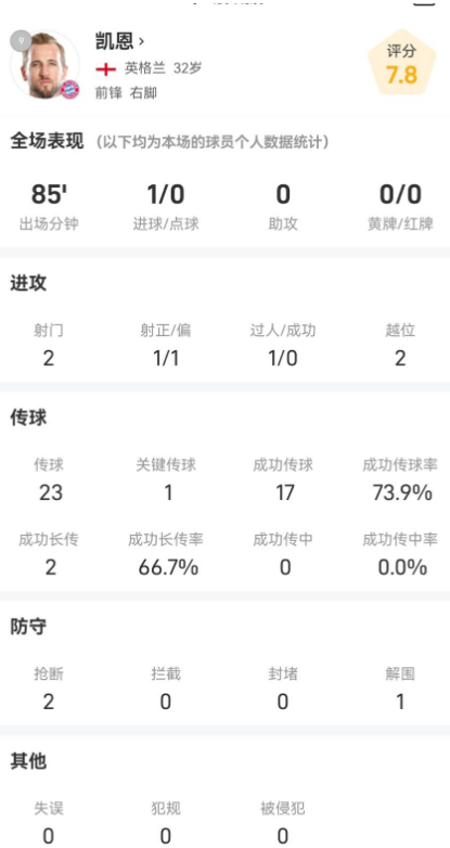 本场比赛中,凯恩首发出场并踢满了85分钟,直至被替换下场。他在进攻端的表现可圈可点,全场共有2次射门,其中1次射正便取得了进球,另1次射门则稍显偏出。此外,凯恩还尝试了1次过人,虽然未能成功,但他在场上的积极跑动和牵扯为拜仁创造了更多进攻空间。
