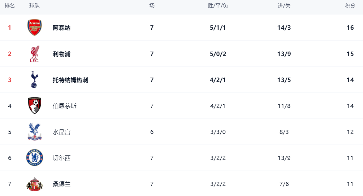 在积分榜上,赢球的阿森纳以5胜1平1负的战绩拿到了16分,成功登顶榜首位置。利物浦虽然本轮落败,但依然以15分排名第2。热刺和伯恩茅斯同积14分,分别排名第3和第4。水晶宫以12分排名第5。切尔西和桑德兰都是11分,曼城和曼联则都是10分。英超的竞争依然激烈,各支球队都在为更好的排名而努力拼搏。