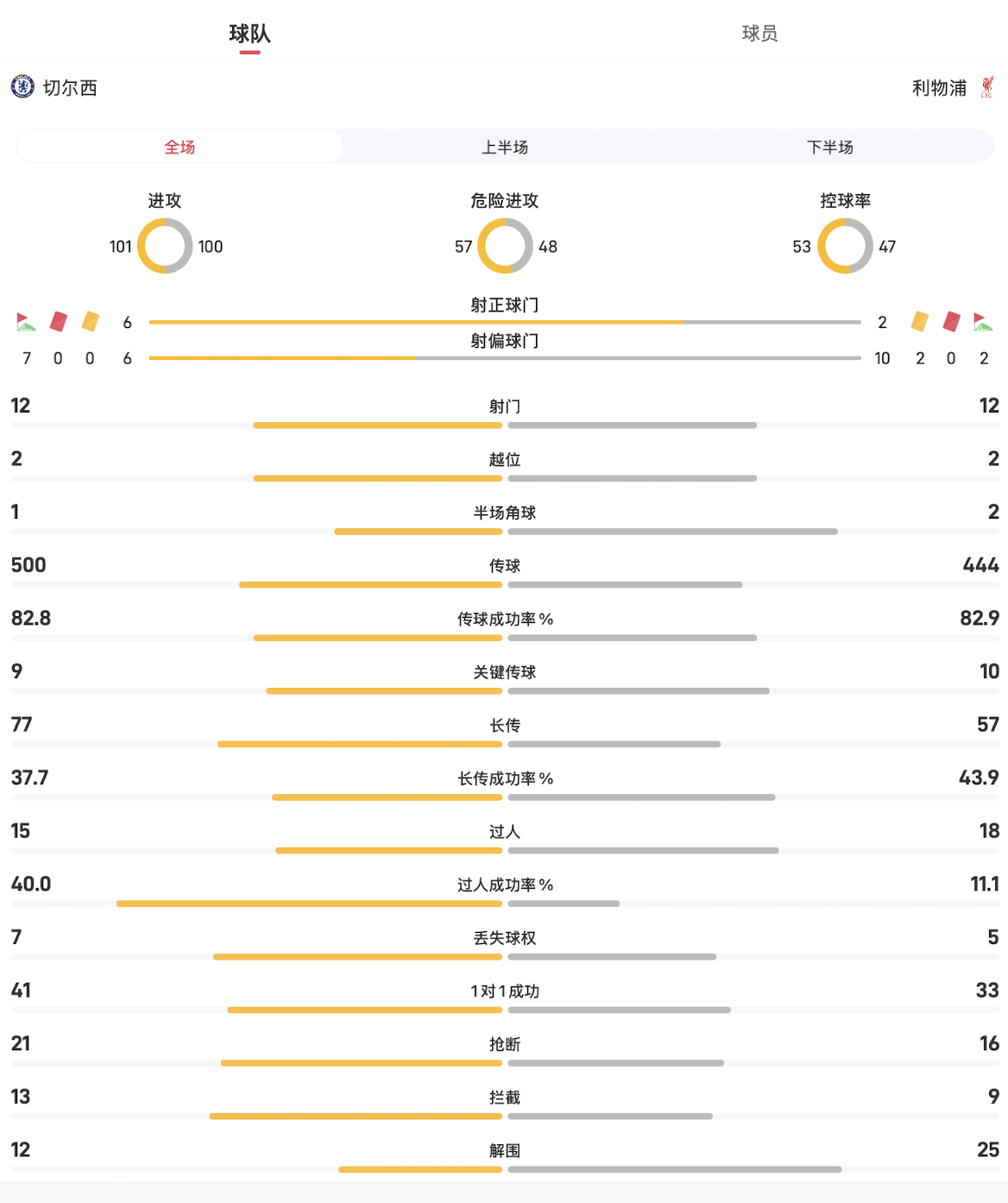回顾全场比赛数据,双方射门次数均为12次,可谓势均力敌。但在射正次数上,切尔西以6-2占据明显优势,这也在一定程度上反映了双方在进攻效率上的差异。传球方面,切尔西以500次对444次领先,控球率也以53%-47%略占上风。角球次数上,切尔西同样以7-2领先,而黄牌数则以0-2少于利物浦,显示出切尔西在防守端的稳健。