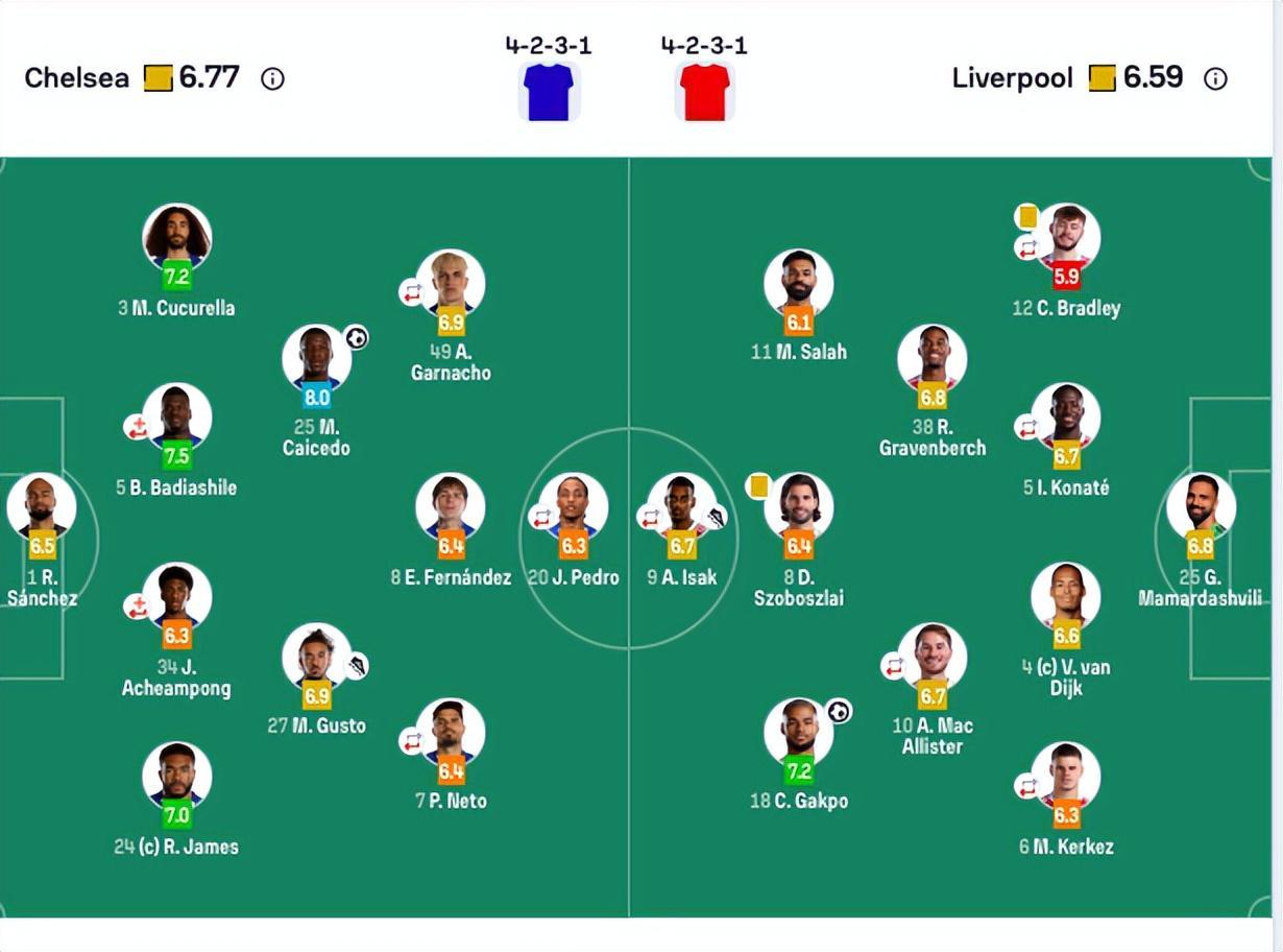 切尔西首发(4-3-3):1-罗伯特·桑切斯/27-古斯托、34-约什-阿奇姆彭(68’21-哈托)、5-巴迪亚西勒(55’45-拉维亚)、3-库库雷利亚/24-詹姆斯、25-凯塞多、8-恩佐/7-内托(75’41-埃斯特旺)、49-加纳乔(75’11-吉滕斯)、20-若昂·佩德罗(75’38-吉乌)