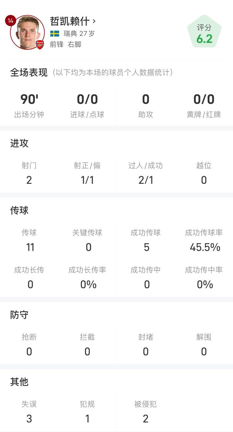 进攻数据:在进攻端,哲凯赖什表现积极,共有2次射门尝试,其中1次射正,展现了其不错的射门感觉。此外,他还尝试了2次过人,并成功1次,为球队的进攻增添了活力。