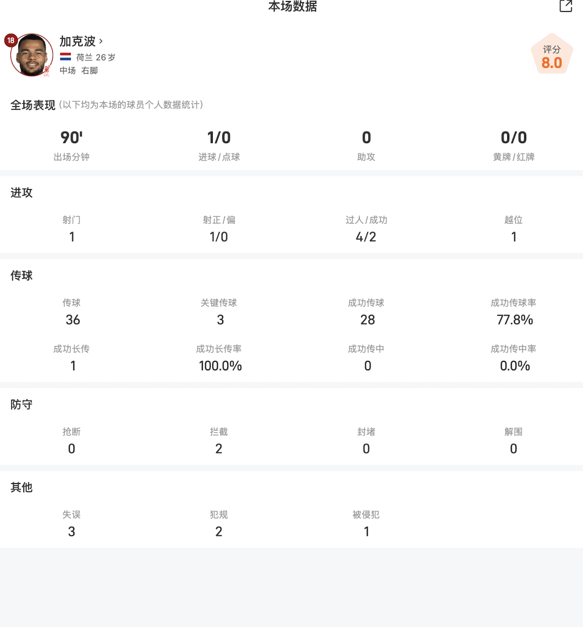 以下是加克波在对阵切尔西比赛中的全场主要数据: