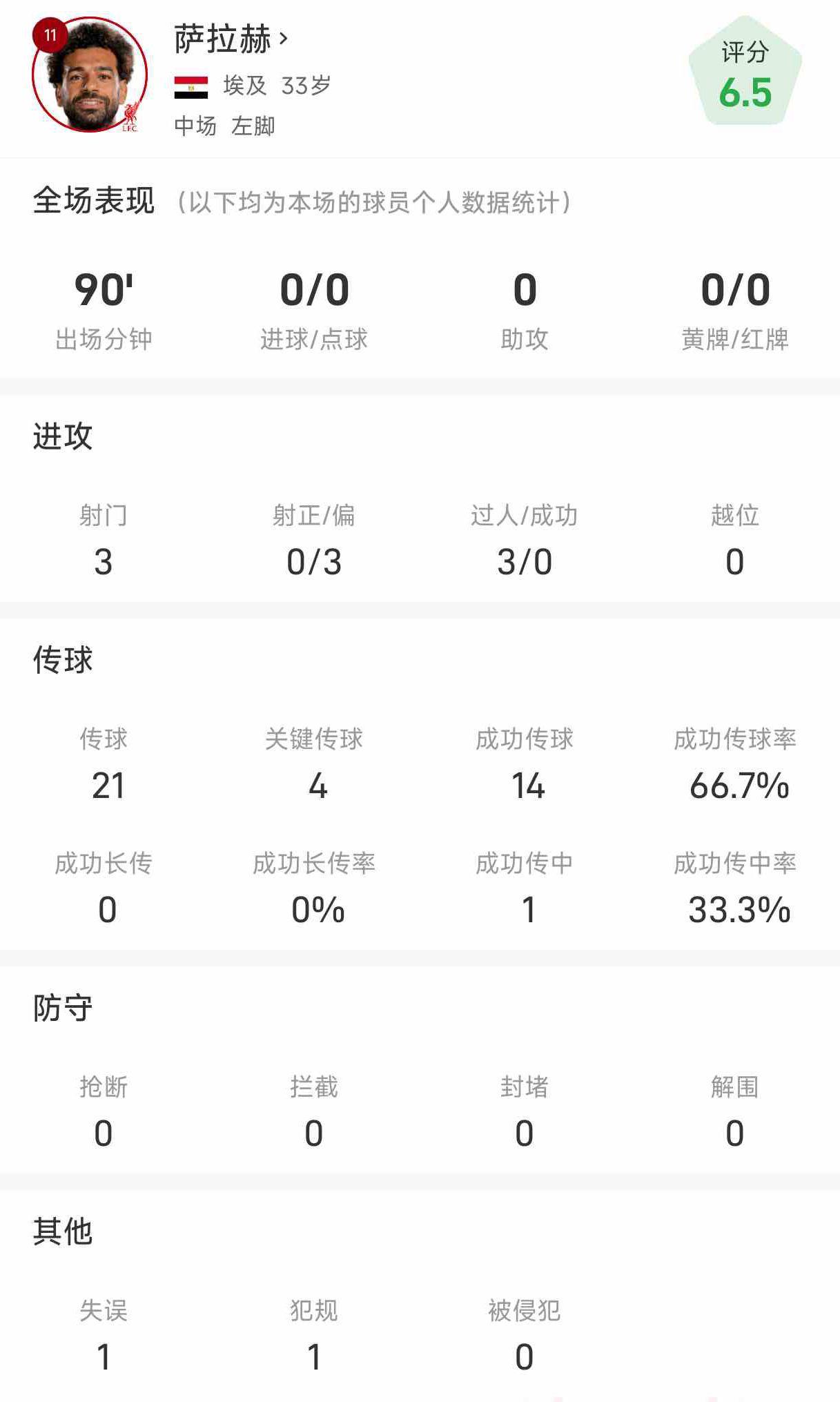 根据赛后技术统计,萨拉赫本场共完成3次射门尝试,遗憾的是所有射门均未能命中目标。在突破环节,这位埃及边锋3次尝试过人均被对手成功拦截,突破成功率暂时挂零。