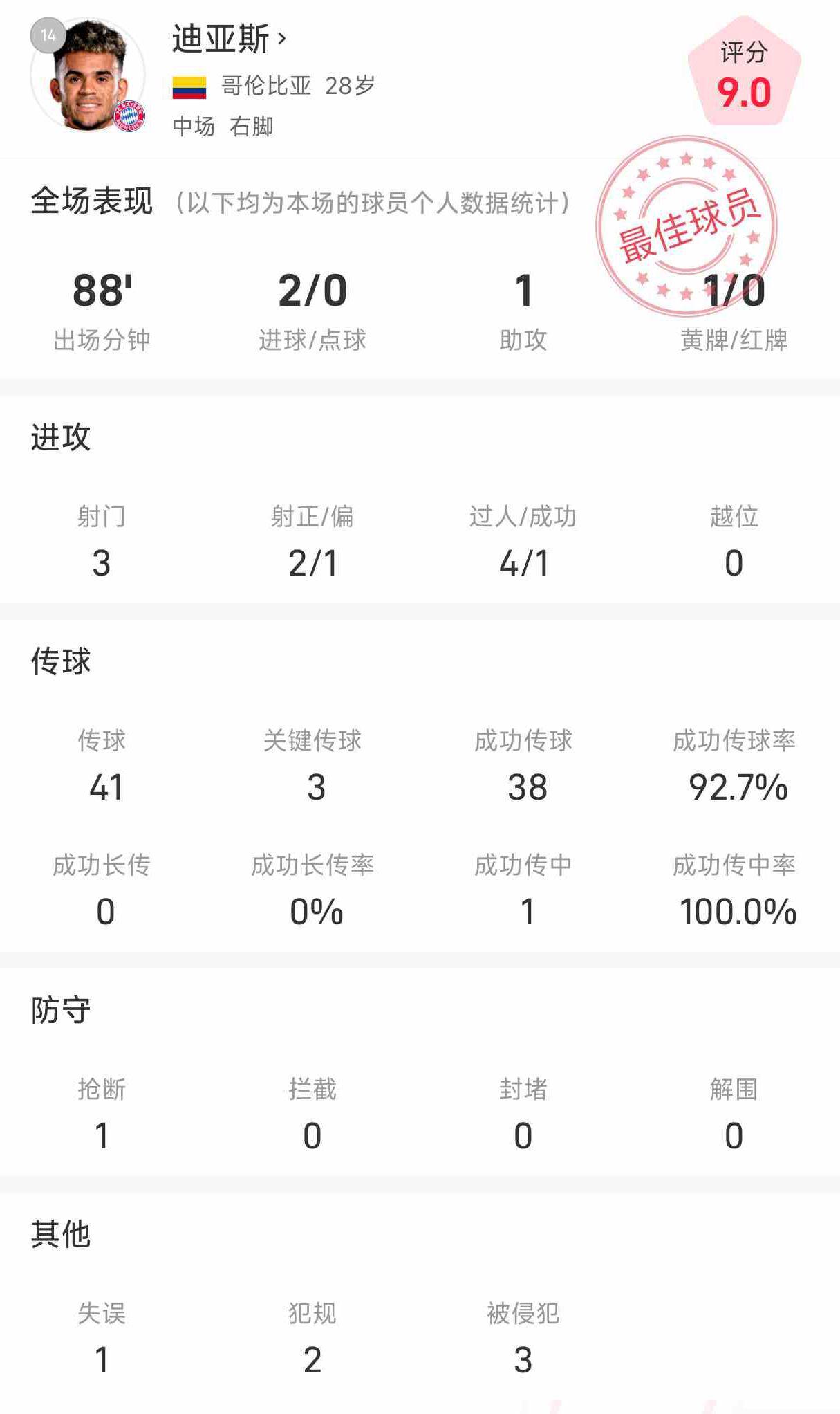 在传球方面,迪亚斯同样表现出色。他全场共完成了41次传球,其中包括3次关键传球,成功传球次数达到了38次,传球成功率极高。这样的数据不仅体现了他在球队进攻中的核心作用,也彰显了他作为中场球员的出色组织能力。