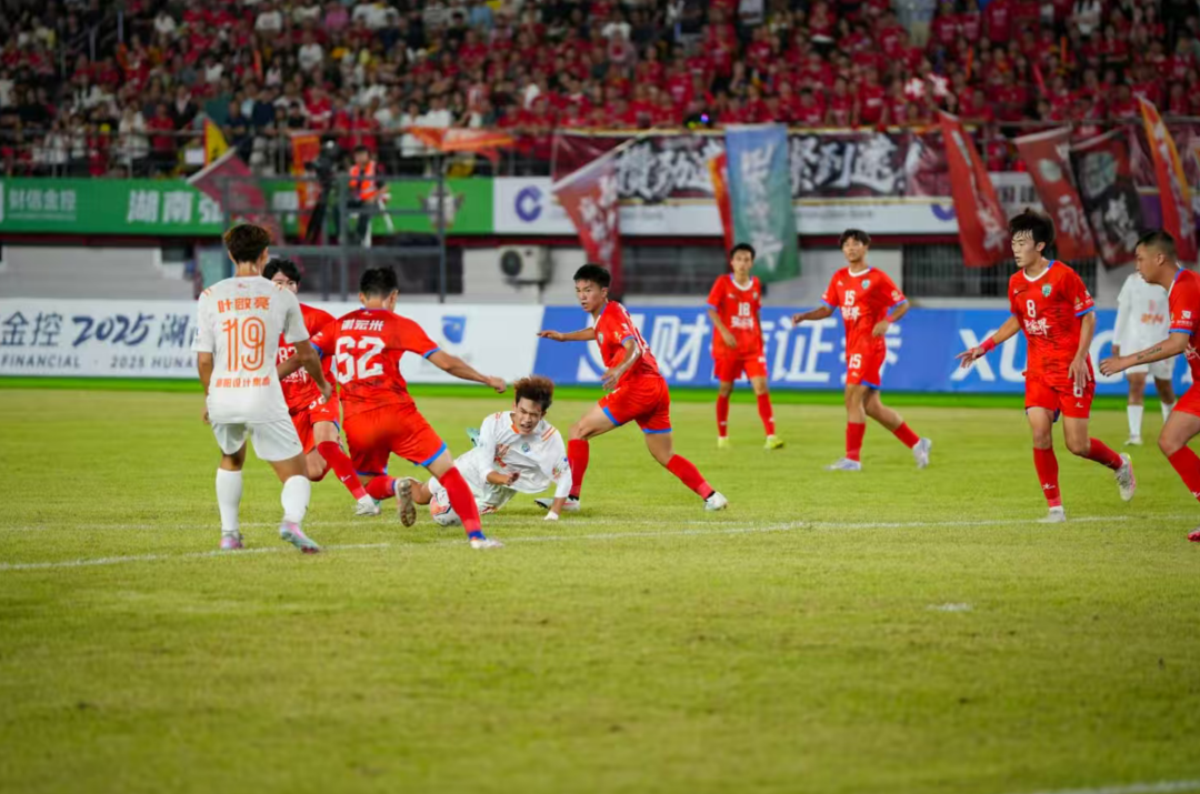 易边再战,邵阳队吹响了反击的号角。他们加强了攻势,试图扳平比分。比赛进行到第68分钟,邵阳队9号球员唐于尧抓住机会,成功破门得分,为球队扳平了比分。