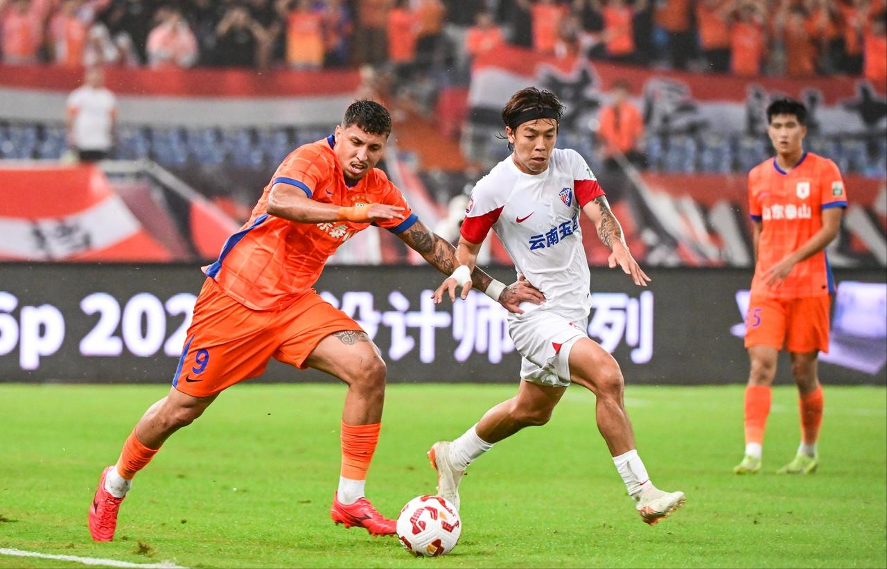 开场后泰山借助主场之势展开猛攻,第6分钟刘洋左路传中,李源一禁区内头槌被马镇神勇扑出。但玉昆的反击更具威胁——第32分钟,奥斯卡右路得球后连续变向突破彭啸和郑铮,精准传中至后点,侯永永力压刘洋头球破门!这粒进球充满戏剧性:侯永永出自国安青训体系,奥斯卡则是泰山旧将,两人联手完成对老东家的反戈一击。