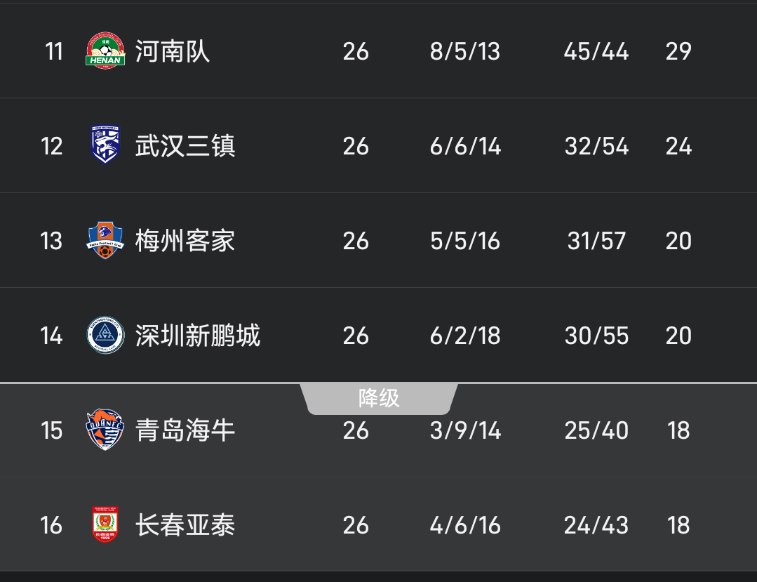 本场比赛结束后,深陷保级泥潭的四支球队——深圳新鹏城、青岛海牛、长春亚泰以及梅州客家,均已完成26轮比赛的征程。目前,保级区的竞争愈发激烈,每一分都显得至关重要。