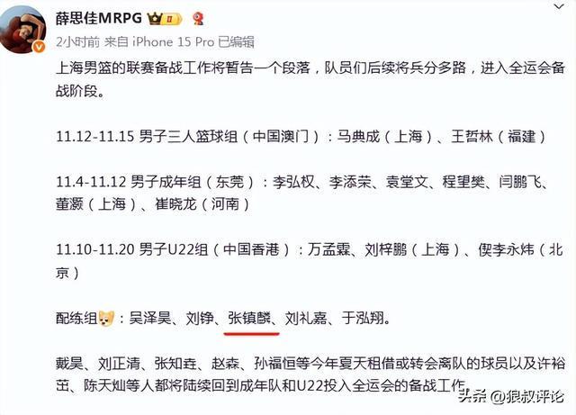 北京时间10月4日,据媒体人薛思佳透露,随着上海男篮热身赛计划的结束,各球员将陆续进入全运会的备战阶段。其中,外界高度关注的张镇麟是否回归辽宁男篮全运会阵容的问题,终于有了明确答案。