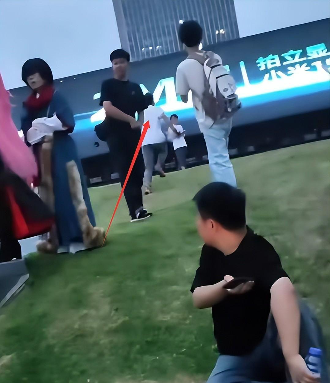 随着围观人群增多,指责声愈发激烈。有人开启直播曝光,有人拍摄视频谴责,现场火药味渐浓。此时,一名穿白色T恤的男子突然从草坪冲出,跳起扯掉男coser的假发后迅速跑向地铁站。