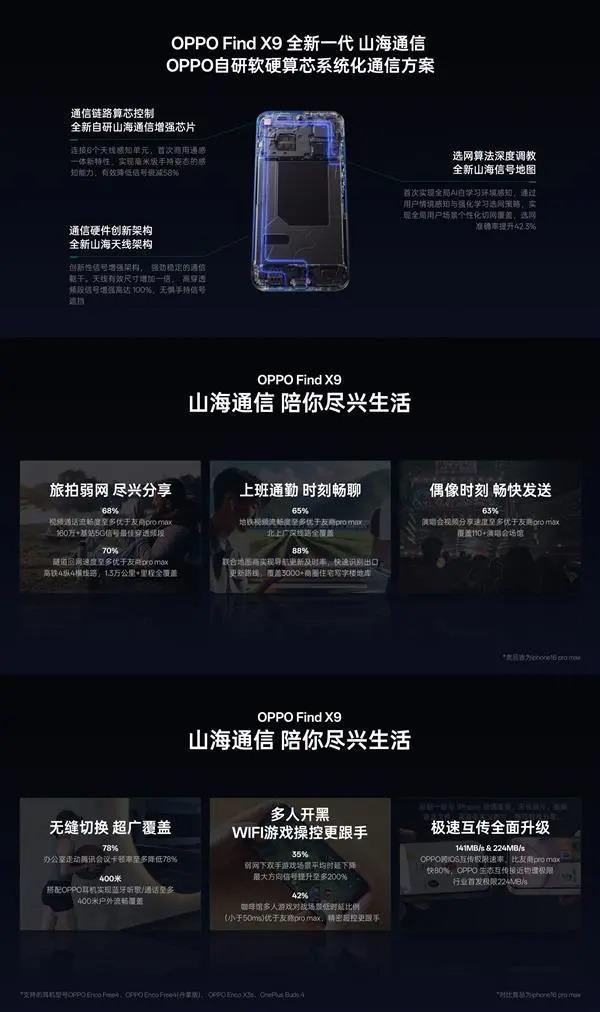 在网络方面,OPPO Find X9系列同样下足功夫。官方为该系列配备了超级山海射频天线,实现行业直板机最长低频天线,天线有效尺寸增加一倍,高穿透频段信号增强高达100%。同时,搭载自研山海通信增强芯片,连接6个天线感知单元电路系统,采用行业首个天线级无线信号感知方案,实现毫米级人因感应,有效降低信号衰减58%,确保用户在各种场景下都能享受稳定、高速的网络连接。
