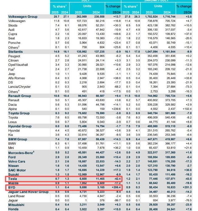 在全球新能源汽车领域,特斯拉曾长期稳坐“领头羊”宝座,但如今欧洲市场的数据却让这一光环黯然失色。据欧洲汽车制造商协会(ACEA)统计,2025年7月,特斯拉在欧盟市场仅售出6600台,同比暴跌42.4%,与2023年11月31810辆的峰值相比,跌幅超过80%。更令人意外的是,同样面临关税压力的比亚迪同期销量达到9698台,成功反超特斯拉。这场“攻守易势”的转变,不仅反映了竞品间的激烈竞争,更揭示了特斯拉在欧洲市场面临的深刻危机。